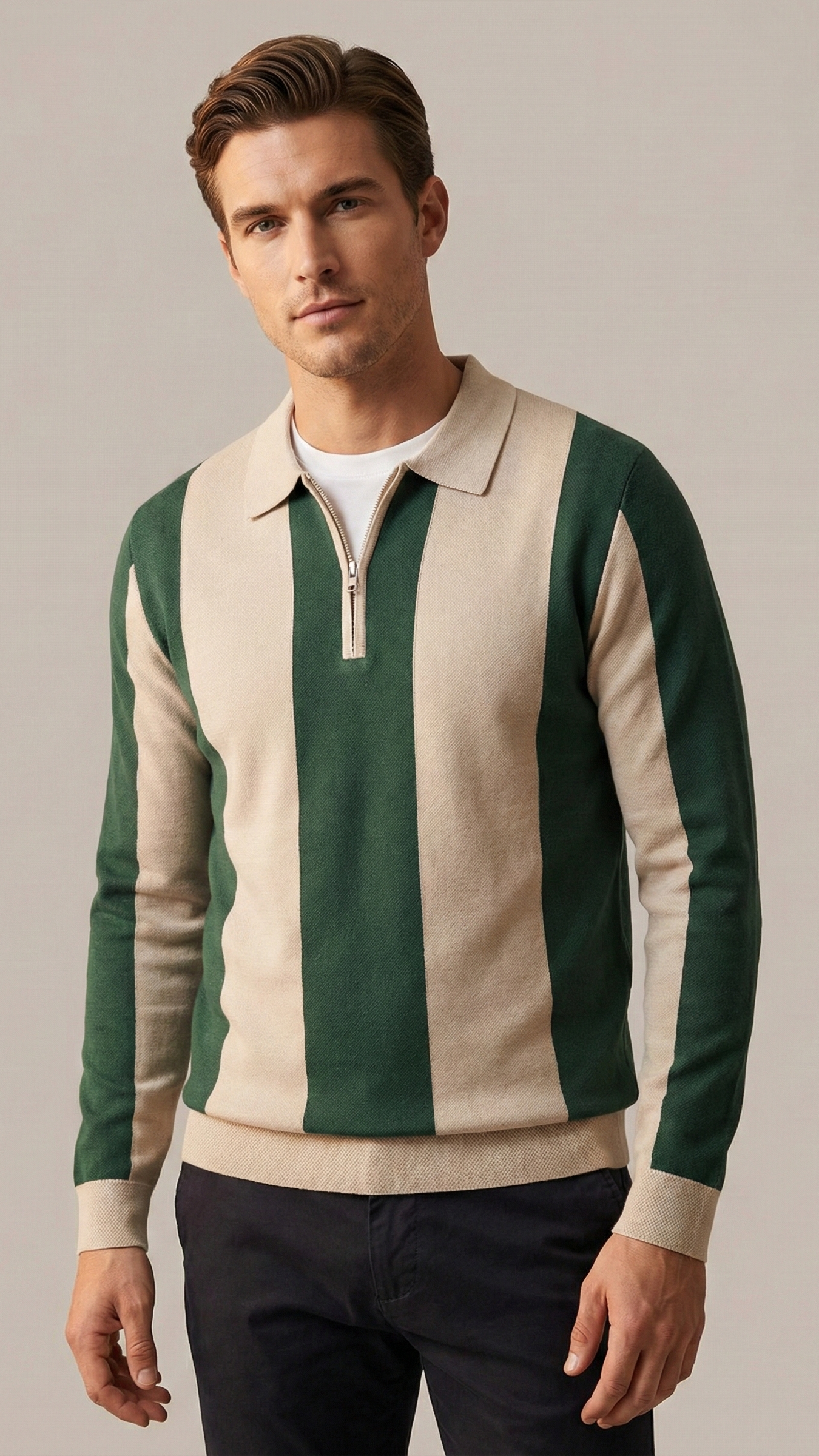 Seamlessly blending retro sophistication with modern tailoring, the Heritage Vertical Stripe Knit Polo is the ultimate statement piece for the refined gentleman. Crafted from a premium soft-touch knit blend, this sweatshirt features bold, wide vertical stripes in deep forest green and sandy cream—a color combination that exudes timeless class.